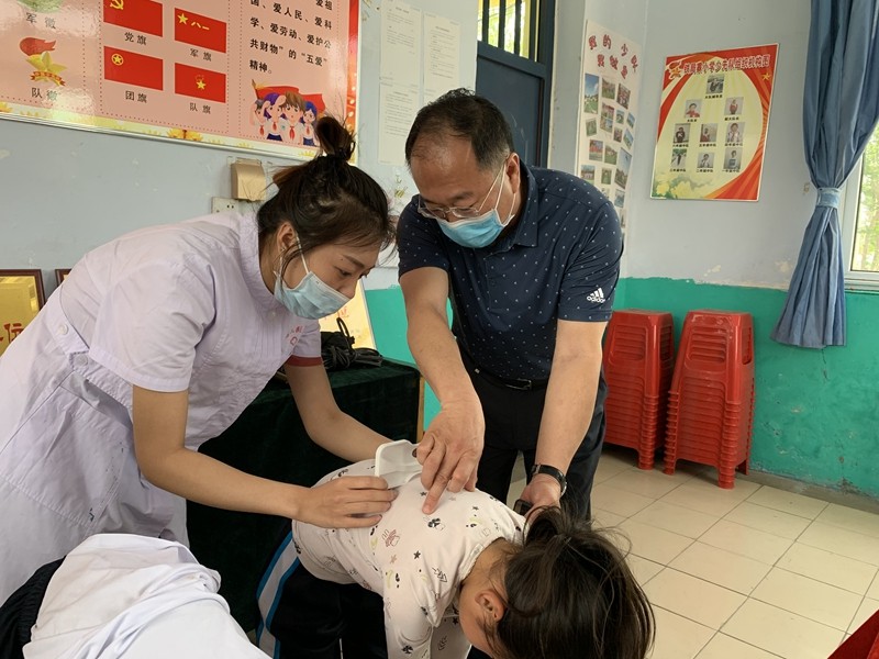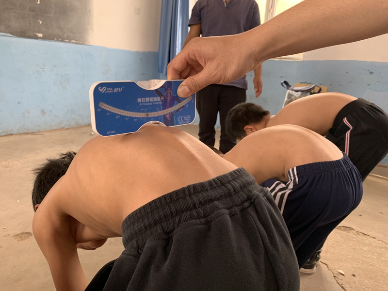 為了及時(shí)發(fā)現(xiàn)病情,及早治療,將脊柱側(cè)彎對(duì)青少年的影響減到最低,5月25日,灤州市人民醫(yī)院脊柱側(cè)彎免費(fèi)篩查小組走進(jìn)安各莊鎮(zhèn)、油榨鎮(zhèn)、九百戶鎮(zhèn)各中小學(xué)校,按照早發(fā)現(xiàn)、早診斷、早干預(yù)、早治療的基本原則,對(duì)三個(gè)鎮(zhèn)的中小學(xué)生進(jìn)行了脊柱側(cè)彎免費(fèi)篩查。本次篩查為初篩,醫(yī)務(wù)人員需要用脊柱測(cè)量器初步篩查學(xué)生們的脊柱情況,脊柱科專家張景瑜針對(duì)篩查活動(dòng)進(jìn)行了現(xiàn)場(chǎng)技術(shù)指導(dǎo)。